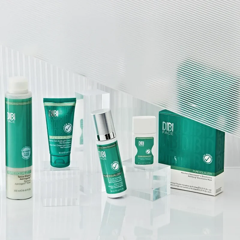 The DIBI MILANO solution for these skin types takes place through two approaches: with the IN phase, the internal balance of the microbial flora and lipidic film is restored; with the OUT phase, external imperfections such as pimples, blackheads and white points are reduced.